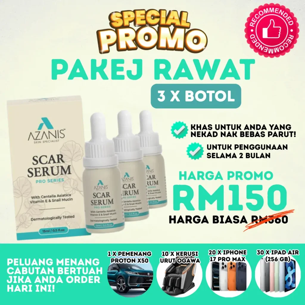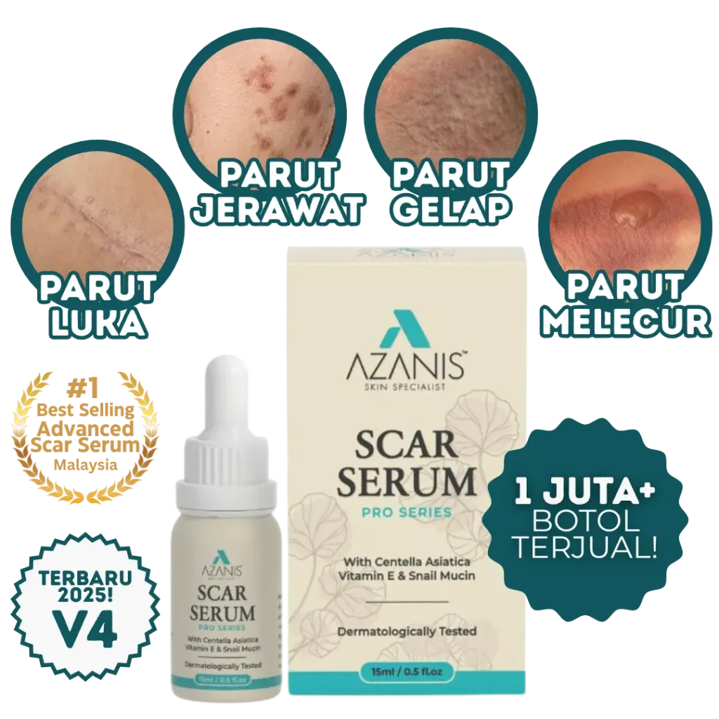 Pilih solusi yang terbukti selamat – Azanis Scar Serum dengan bahan semula jadi premium, kini disahkan selamat oleh KKM.